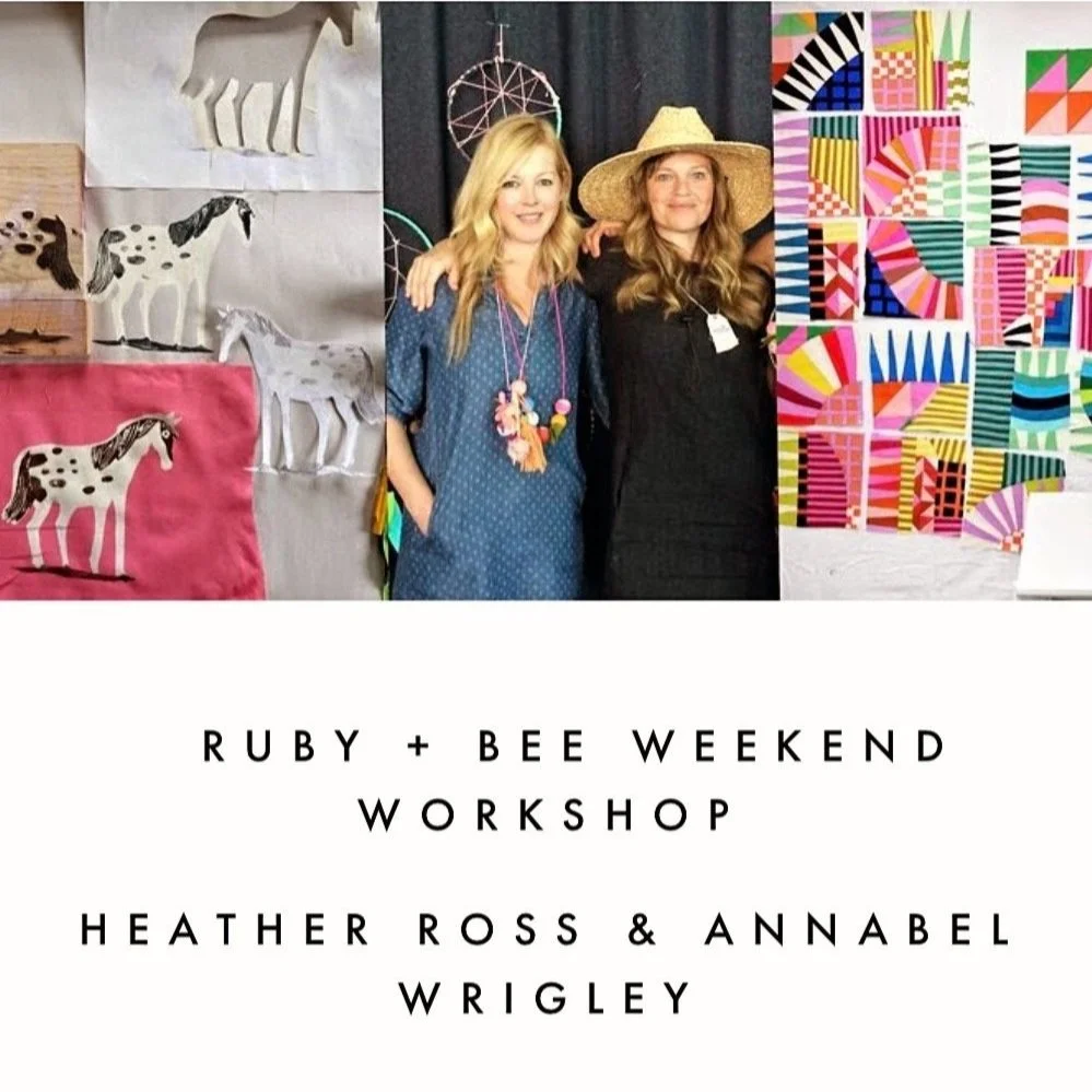 Our weekend includes two workshops: Printing Fabric by Hand with Heather Ross, and Improvisation Art Quilts with Annabel Wrigley. You’ll learn Heather’s favorite technique for hand printed fabrics, using color discharge and block printing. You’ll create your own design and learn to make your own stencils and blocks. You’ll also learn Annabel’s wildly popular improvisational art quilt methods, playing with color and shape while exploring piecing techniques to create a small framed quilt study. We will have a huge assortment of Ruby and Bee fat quarters to choose from for both workshops.